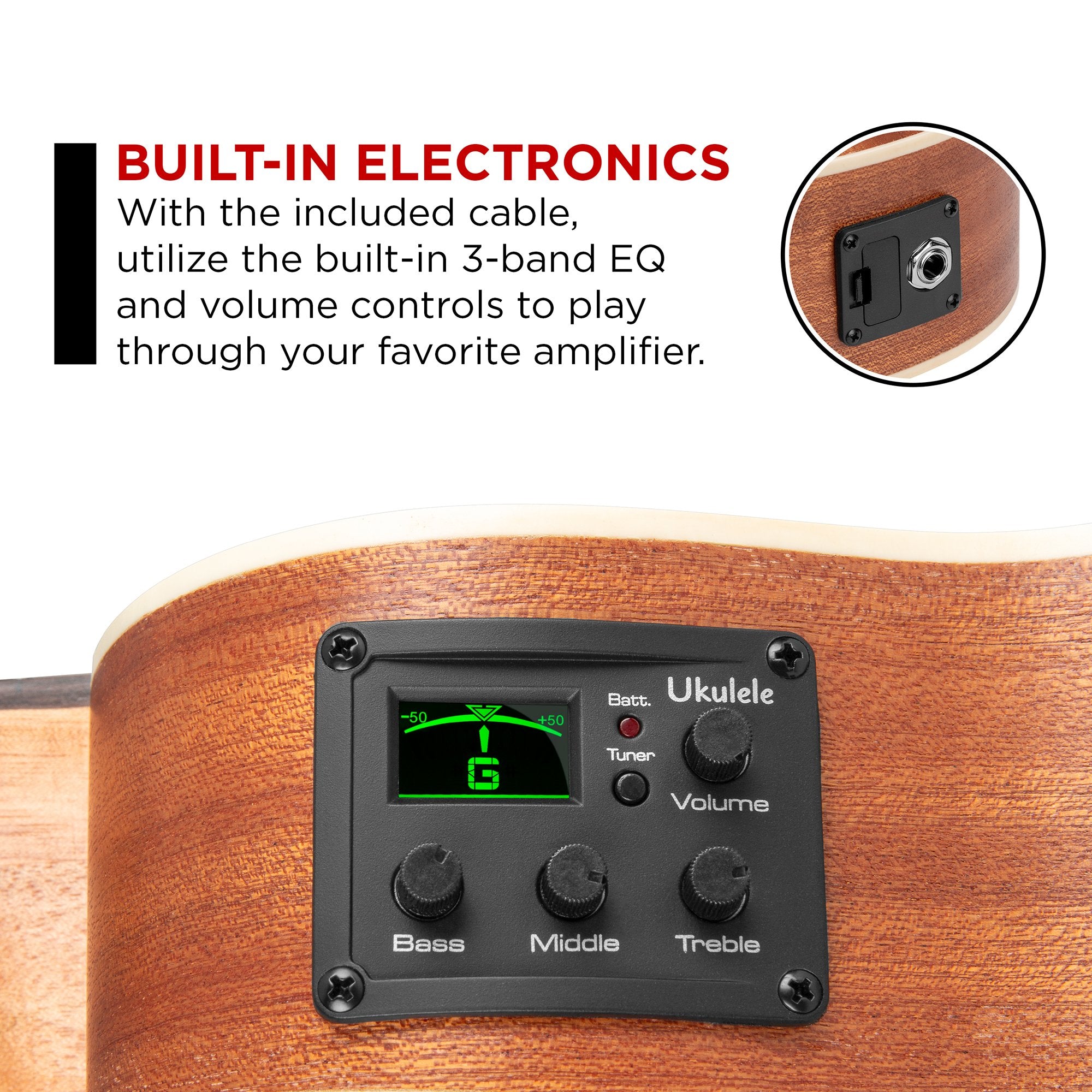 • ALL-INCLUSIVE SET: Includes a gig bag, ukulele strap, picks, extra strings, a digital clip-on tuner, and a 1/4-inch amplifier cord (amplifier not included) so you have everything you need to practice and perform
