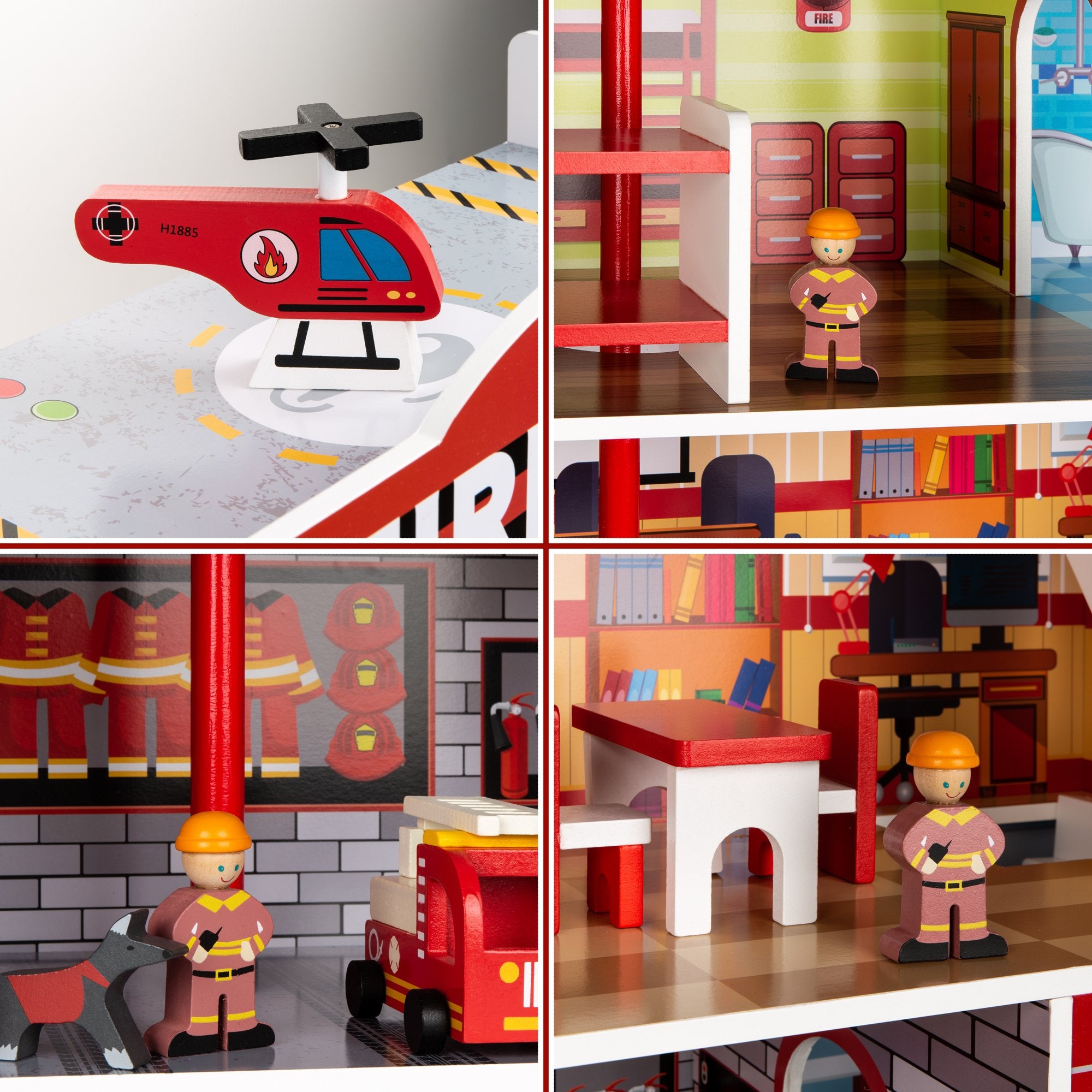 TOY VEHICLES INCLUDED: Fight fires high or low with a set of wooden vehicles: a fire engine with its own garage and a helicopter with its own roof-mounted helipad