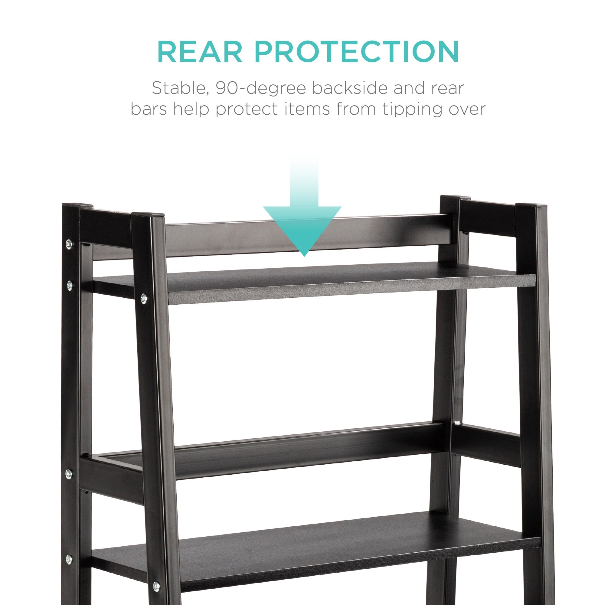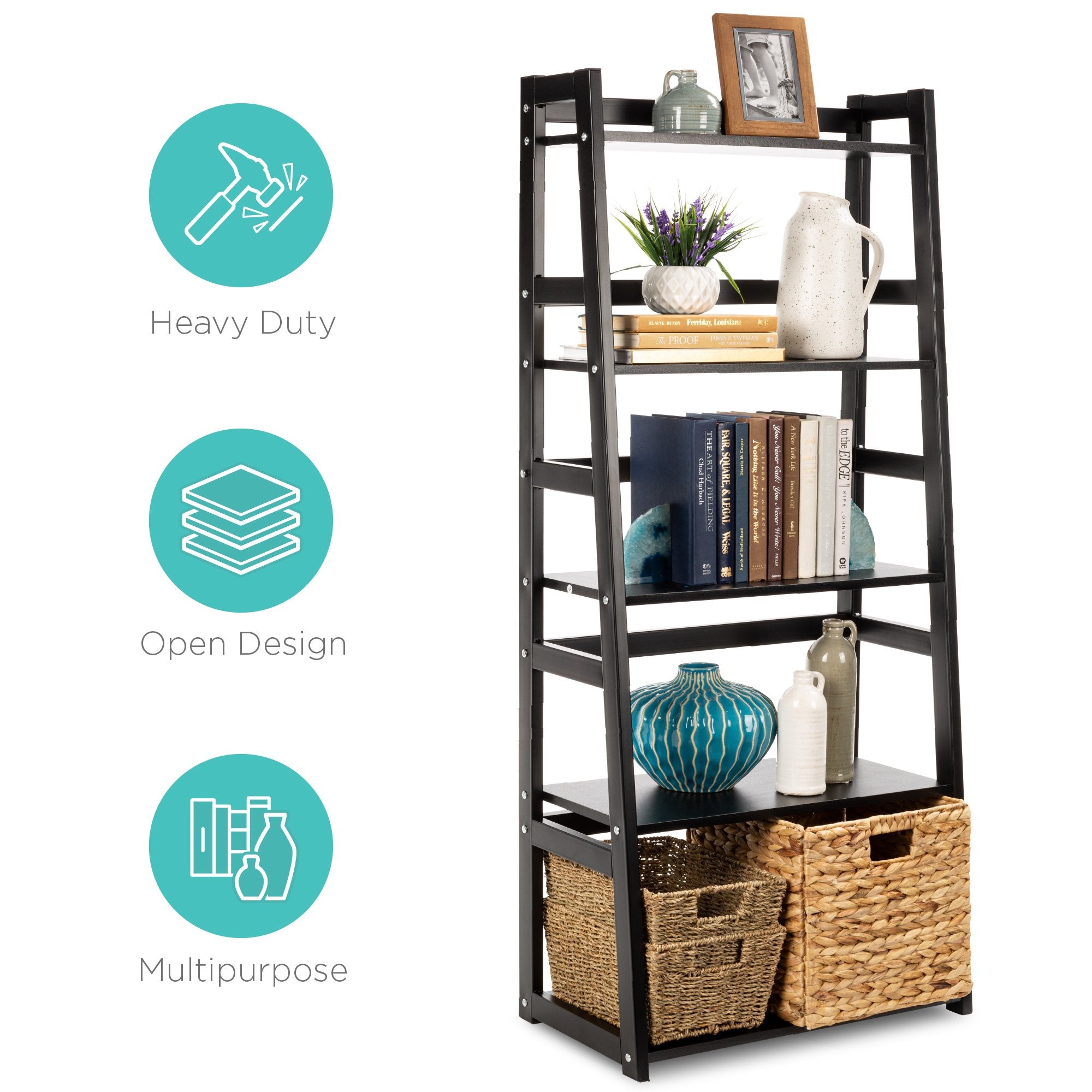 PLENTY OF STORAGE SPACE: 5-tier design includes ample shelf space for books, collectibles, pictures, plants, and more, plus open ends on each side that provide easy access to all your stored items