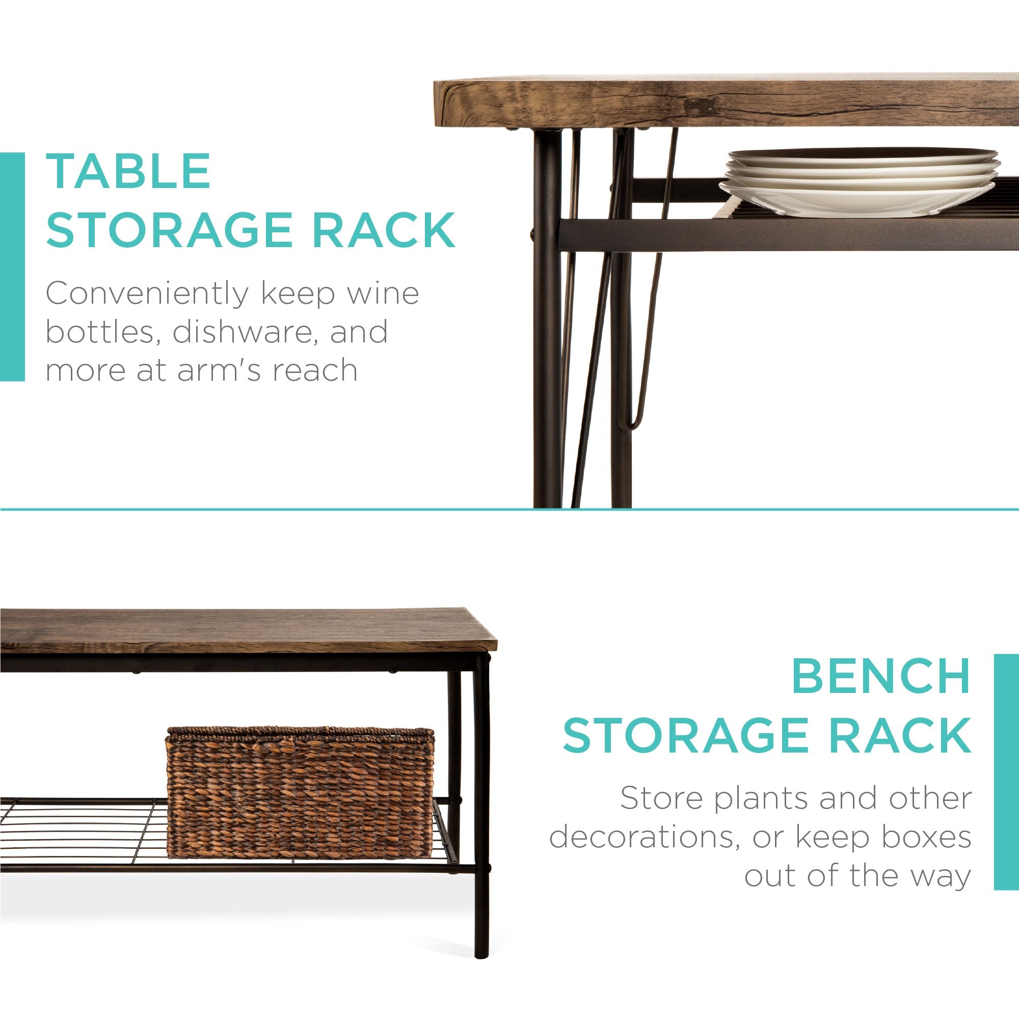 BUILT-IN STORAGE RACKS: Metal racks under the tabletop and the bench can conveniently hold books, board games, seat cushions, blankets, table mats, coasters, and much more