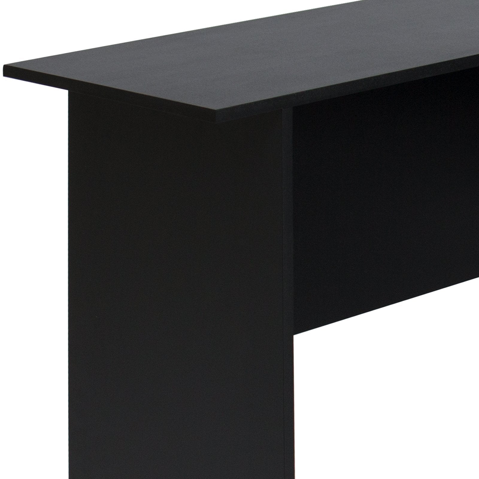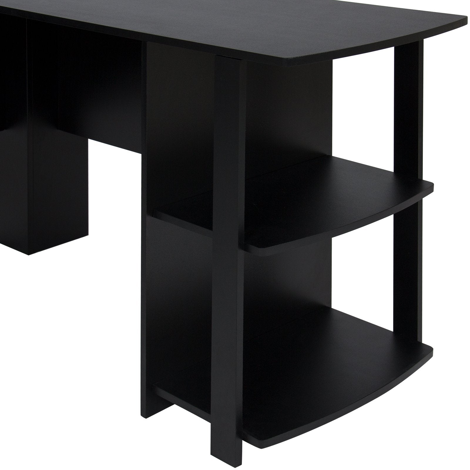 A side of the table is built with 2 open shelves, ideal for printers, scanners, and books