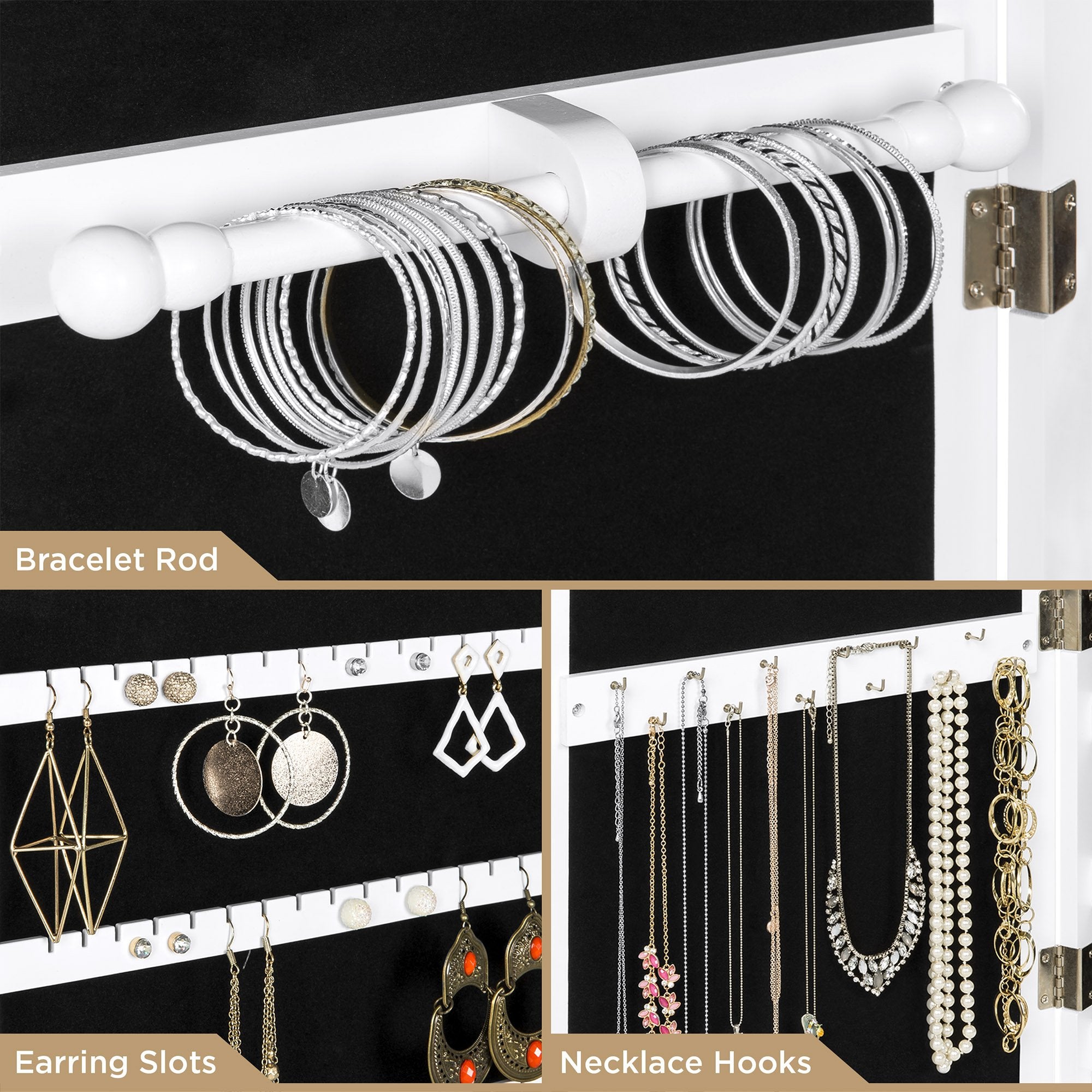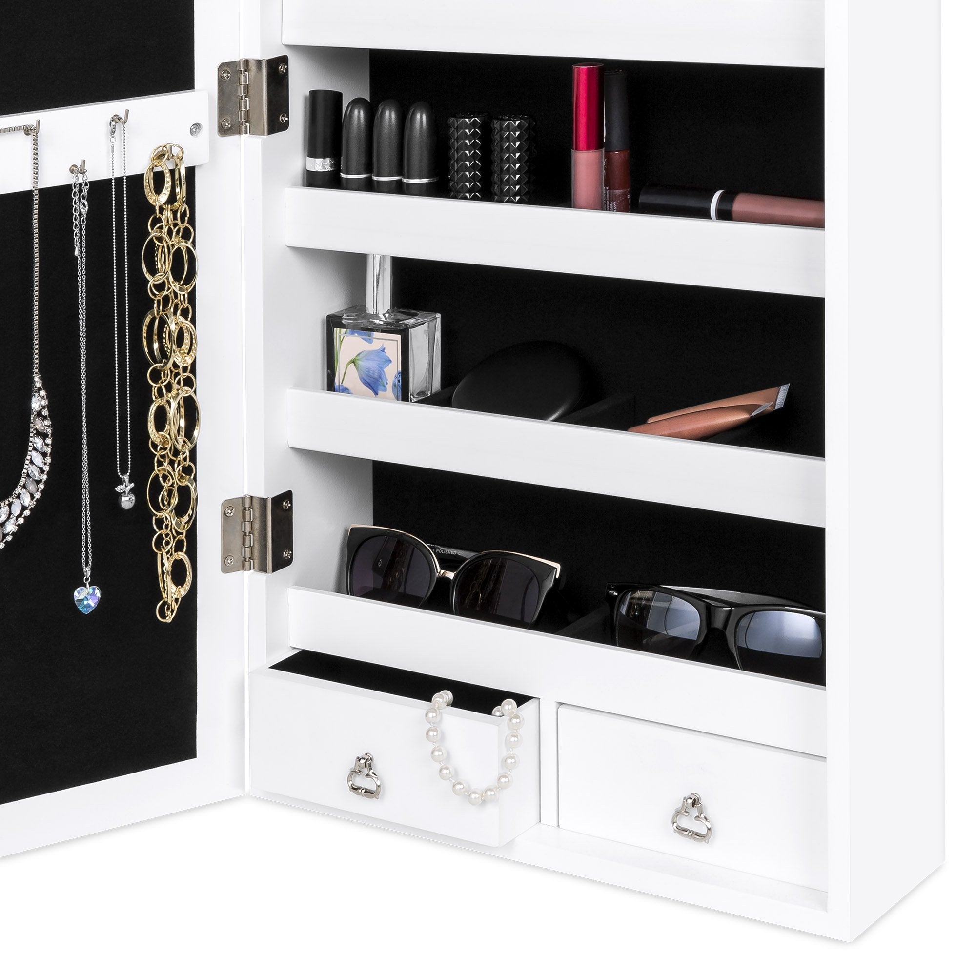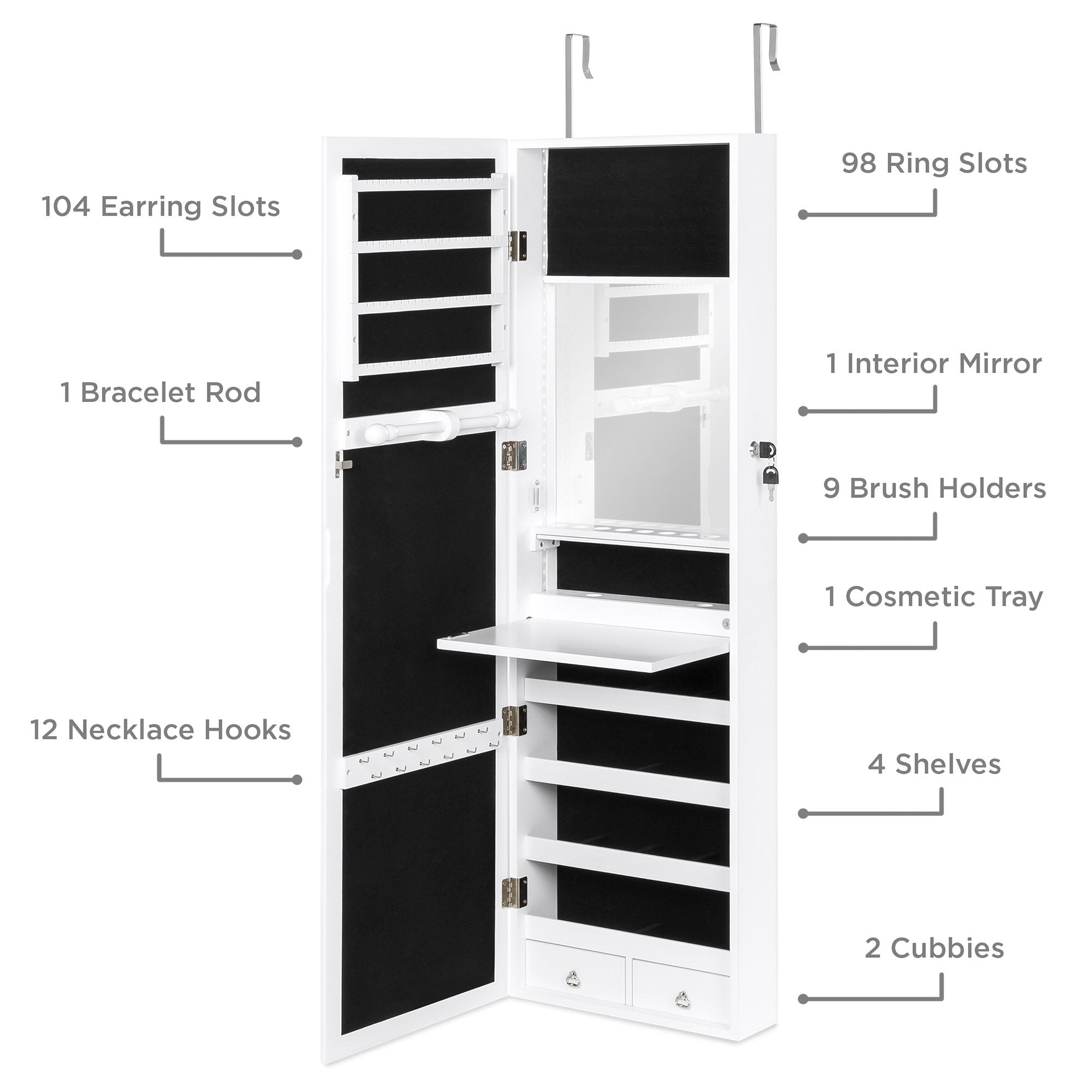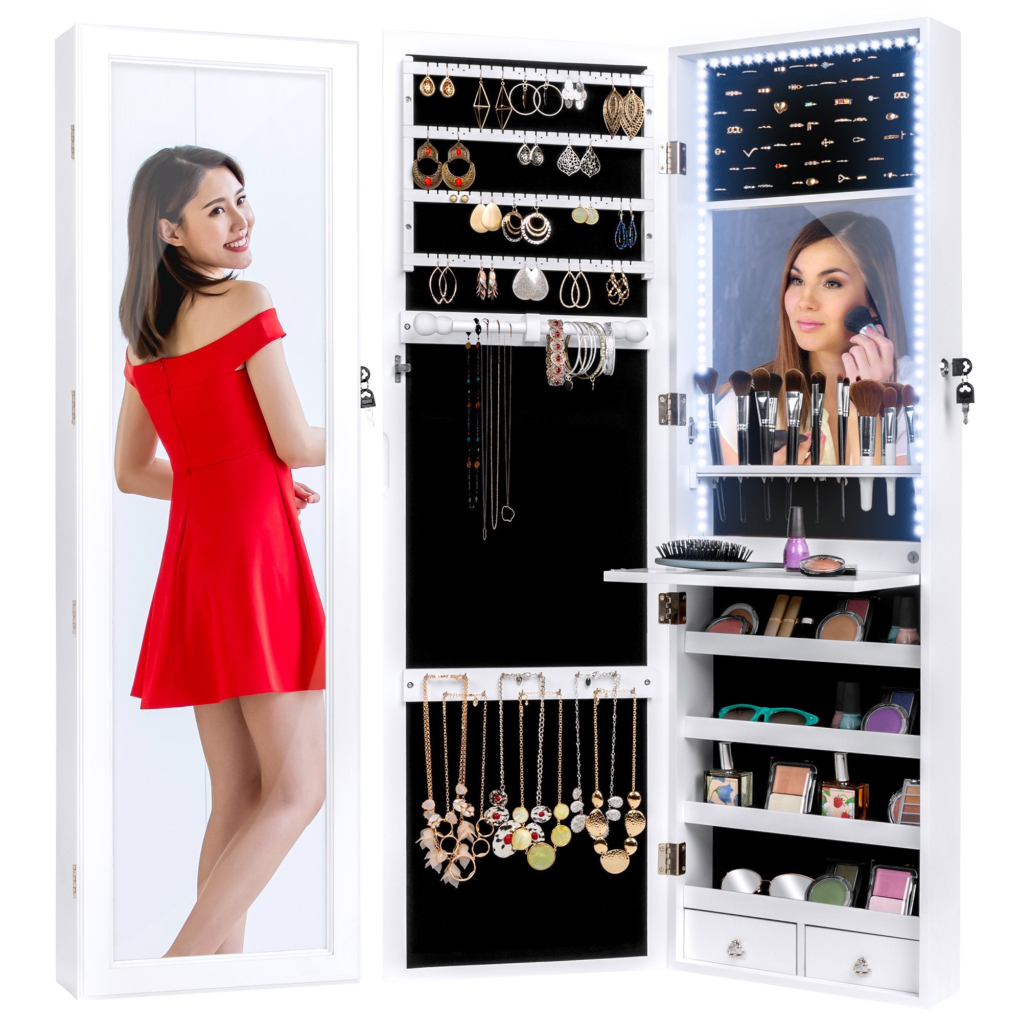 Door/Wall Mount Mirror Jewelry Cabinet Armoire w/ Inside Mirror, LED Lights